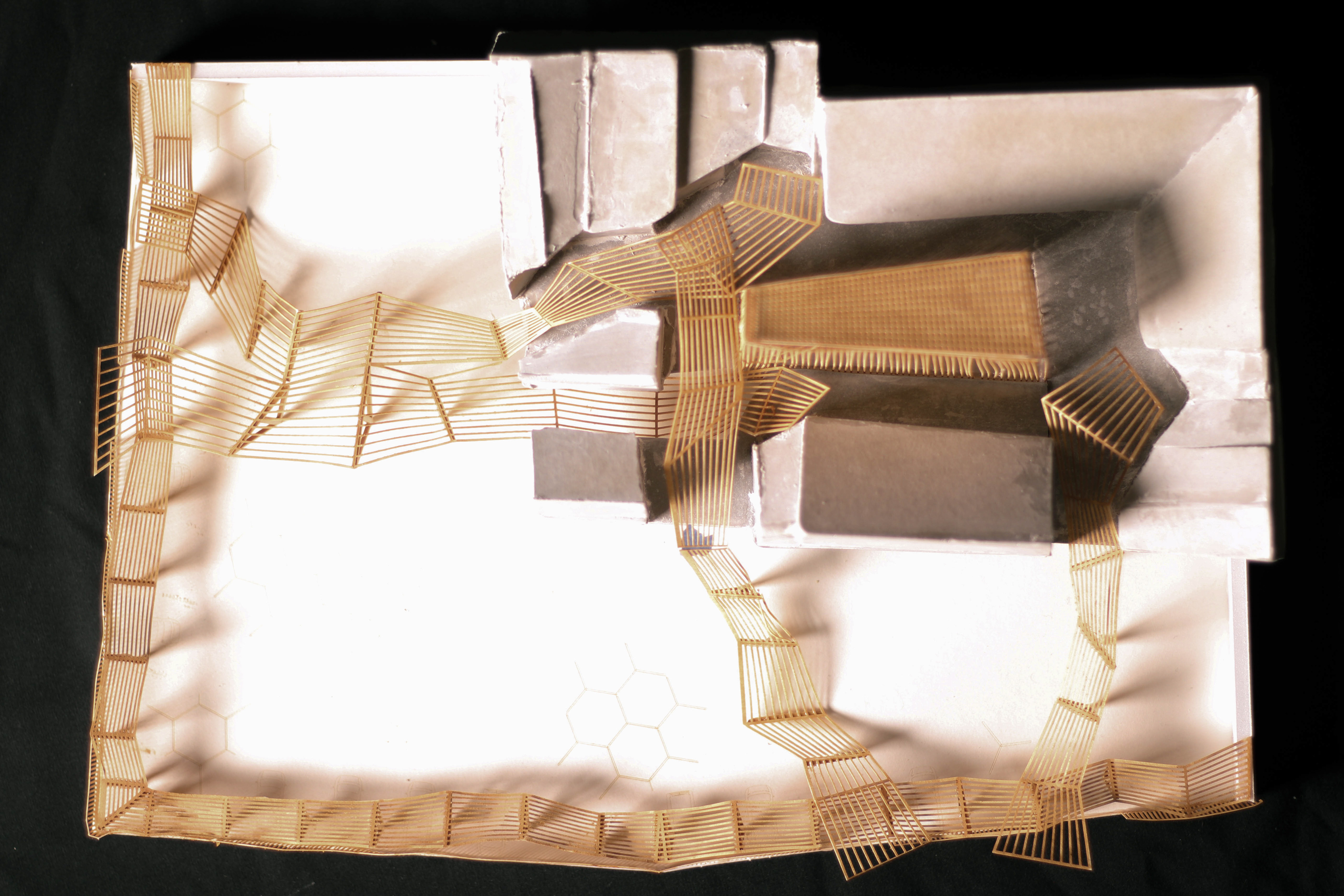 The model tripods were constructed at 3/4”=1” scale to simulate their true spatial implications while working with commercially available bamboo. Six-foot bamboo lengths were cut to size and connected through a system of PVC and masonry wire. Like the spaces they represent, bamboo cannot be treated abstractly, but each piece must be modeled separately to fit its place. These loose-fit connections represent the loose-fit programming present in the main film school.