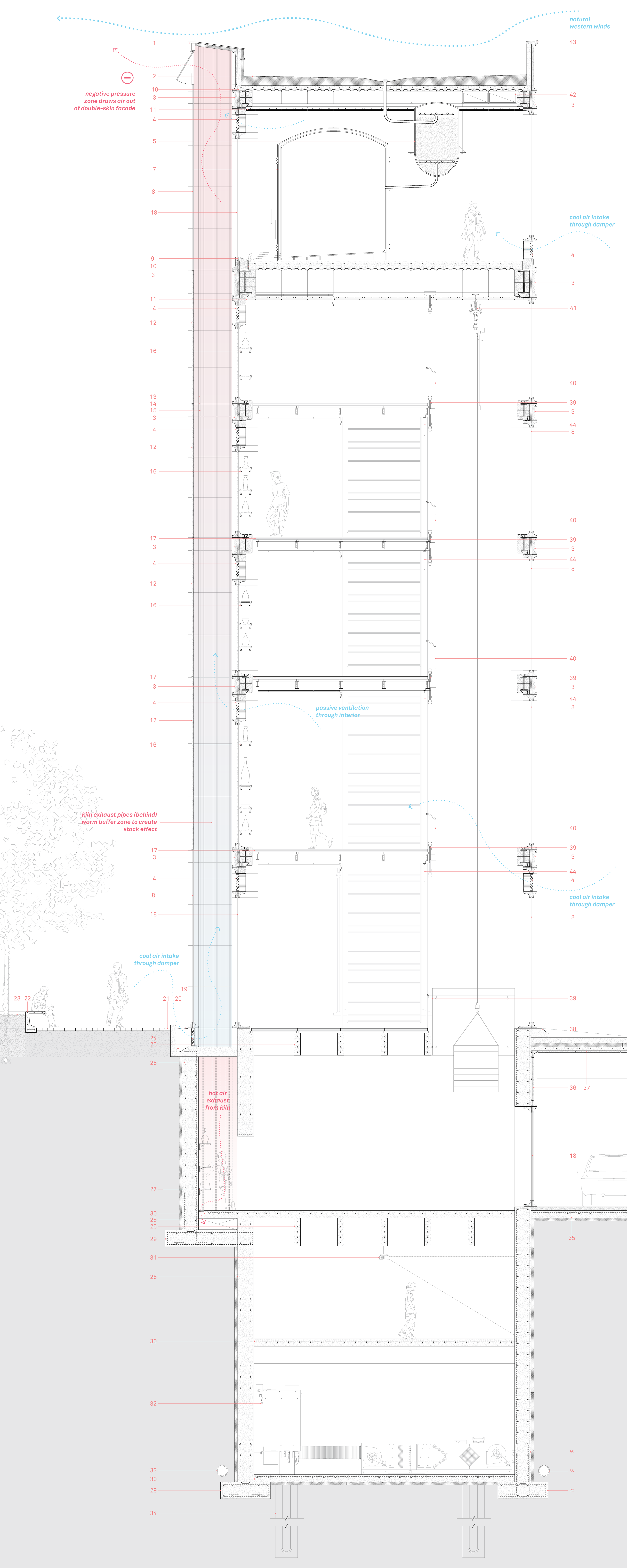 In the summer, the same heat produced by the kilns and stored in the double-skin East facade is used to drive stack-effect ventilation. Large doors on the bottom of the West facade, along with operable dampers on higher floors, facilitate a controlled intake of air. This air is drawn through the Exhibition Wall and into the double skin through an additional set of dampers on the opposite side. Due to the high temperature of the double-skin air and the negative pressure on the eastern side of the building, based on prevailing western winds, a constant flow of air out of the east facade will be supported, driving air movement throughout the rest of the Exhibition Wall. In the Process Bar, a similar effect is achieved through active fans and a double-skin glass facade. In the winter, the louvers are closed to retain an air barrier and conserve heat. In the summer, the fans actively draw air through the double-skin. Interior operable windows can direct the air into the Bar volume. Windows on the opposite North facade facilitate cross-ventilation.