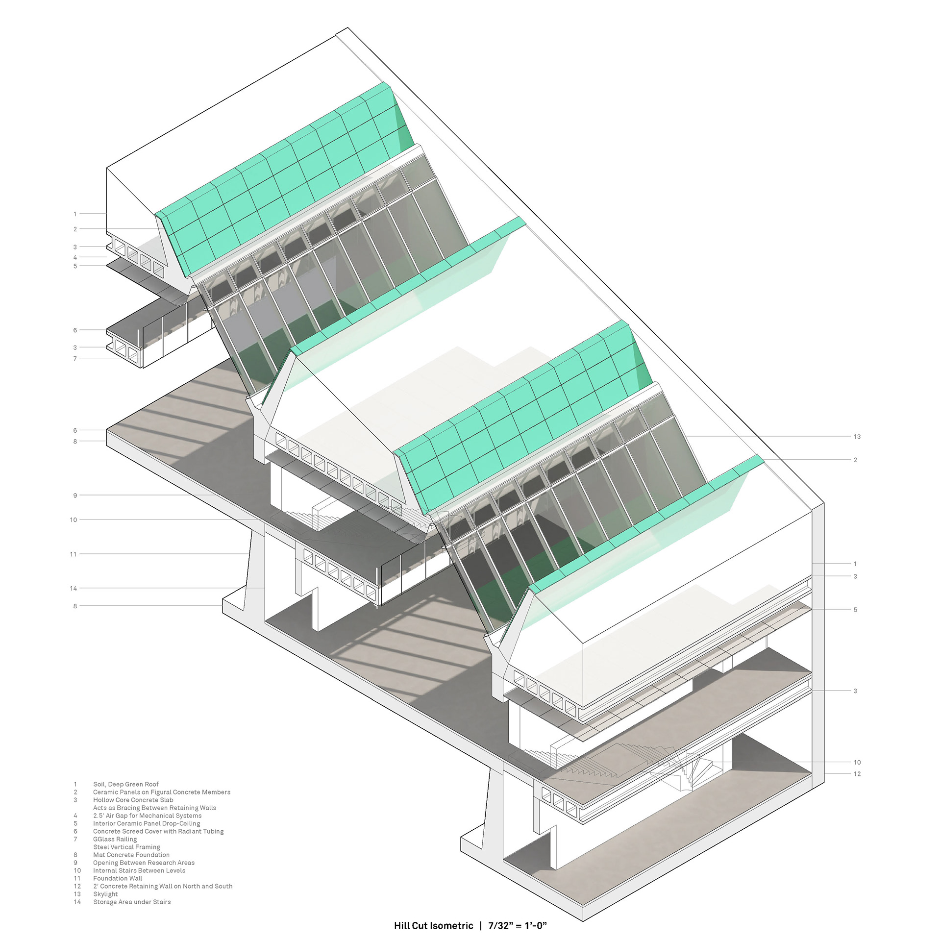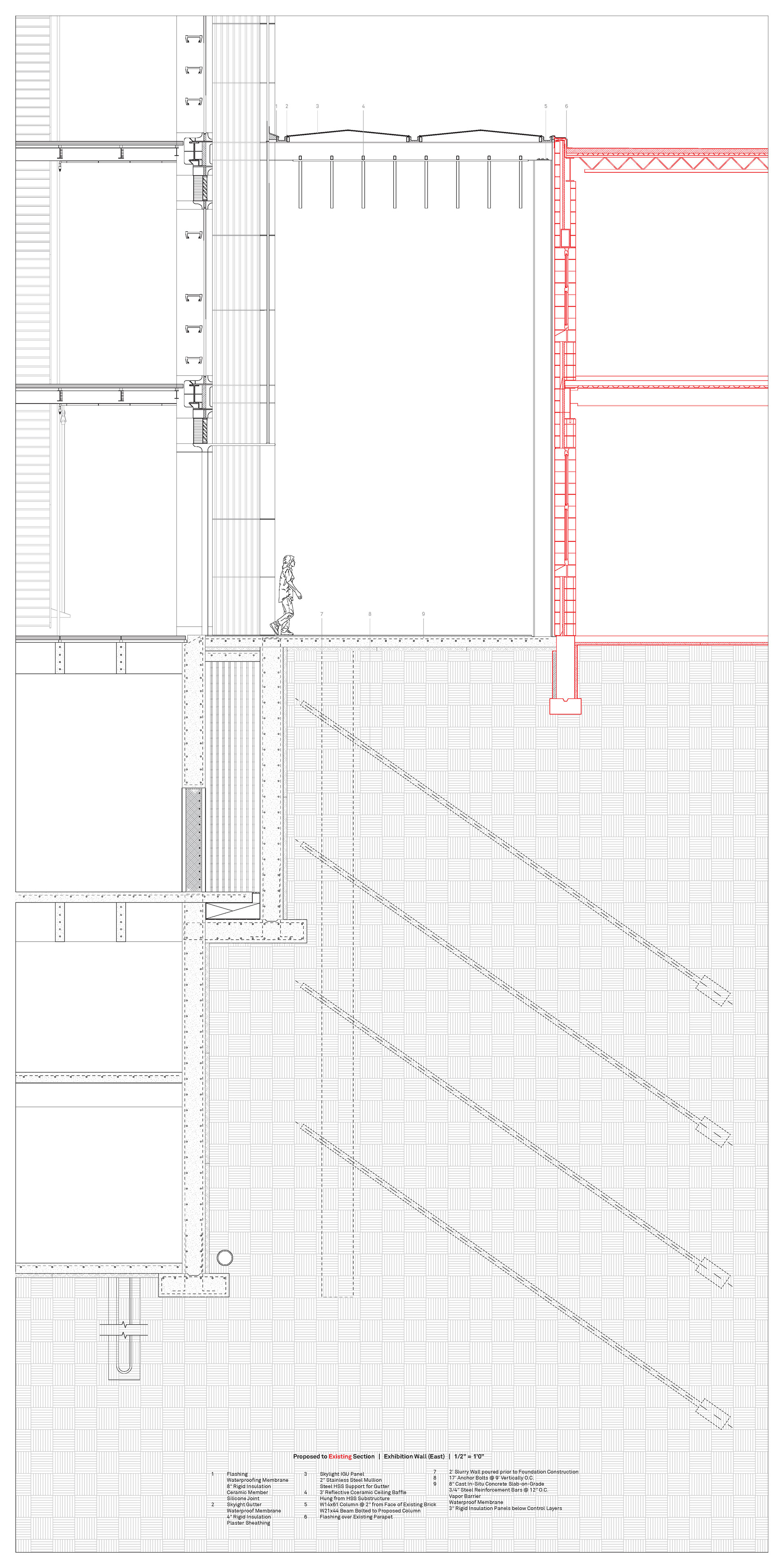 Upon completion, the ceramic vessel moves through the Crossing and into the Exhibition Wall. Using a post-tension rod and extruded ceramic member system as curtain walls on either side, the exhibition space functions as a piece of art in itself. Using hanger rods, exhibition floors are suspended from above, providing clearance for a hoist crane, like in the bar, to facilitate material movement between each exhibition level and the studio spaces and loading dock located in the Bar. Under the Exhibition Wall, in the first basement level, kilns line the eastern wall and are exhausted through the eastern double-skin facade. Film galleries and storage are located below the kilns.